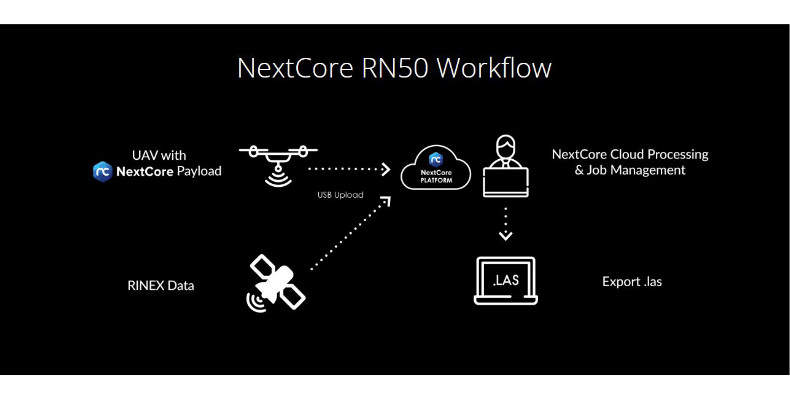 The NextCore RN50 Drone LiDAR is designed for the DJI Matrice 600 to create high-quality terrain models. It can scan up to 50 hectares (500,000 sqm) in a single flight and has a 50mm RMSE accuracy.