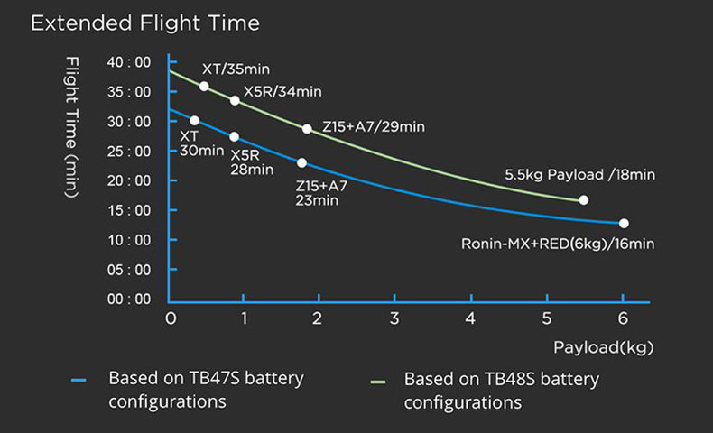 With TB47S batteries, the M600 can fly for 35 minutes with no extra payload or 16 minutes with 6kg of payload. With TB48S batteries, the M600 can fly for 40 minutes with no extra payload or 18 minutes with 5.5kg of payload.