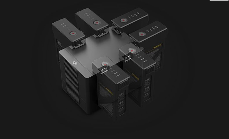 The M600 Pro charger has six charging hubs, enabling it to charge six Intelligent Flight Batteries simultaneously. All six batteries can be fully charged in a short amount of time, for quick efficient preparation.