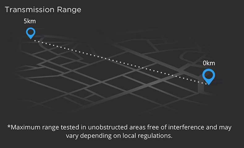 Max Transmission Distance FCC Compliant: 3.1 mi (5 km), CE Compliant: 2.2 mi (3.5 km) (Unobstructed, free of interference)