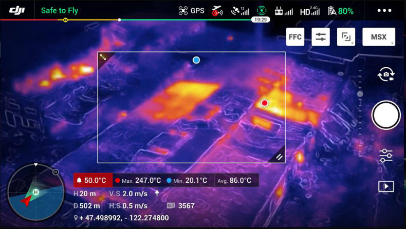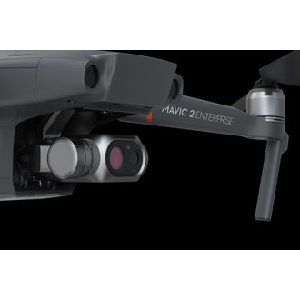 Having the same form factor that of the Mavic 2 Pro the Mavic 2 Enterprise Dual features a three-axis gimbal stabilized camera housing a side-by-side 4K sensor for capturing visible light and a FLIR Lepton® thermal microcamera for capturing thermal data. The sensors of the Mavic 2 Enterprise Dual allow pilots to perform lowlight or night operations, as well as fly in complex daytime conditions like fog and smoke. Pilots can select from different intelligent display modes in the DJI Pilot flight control app to visualize data from the dual-sensor camera: