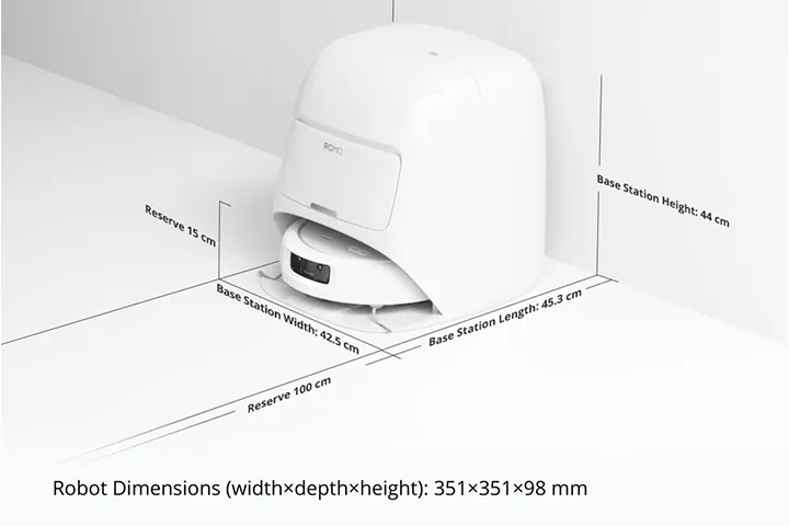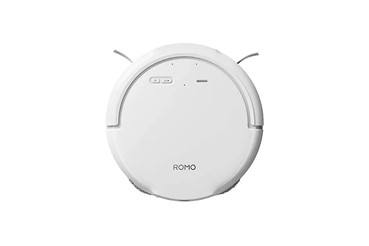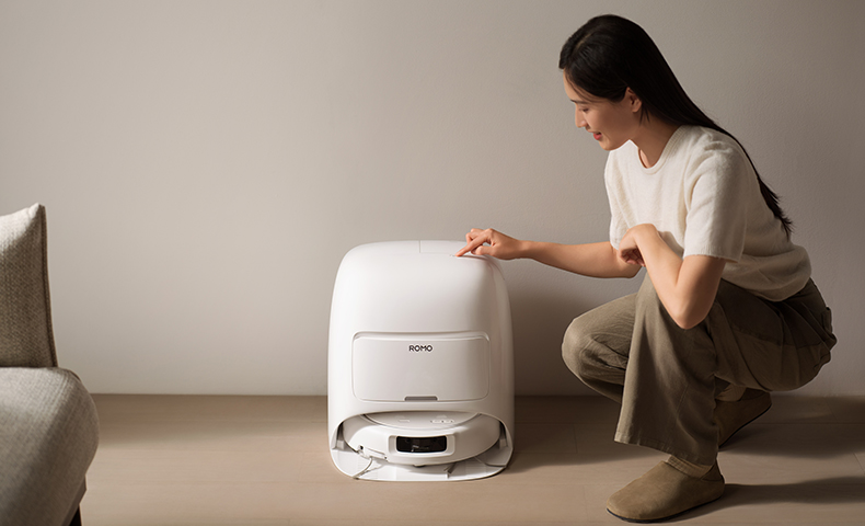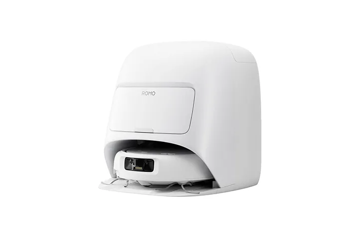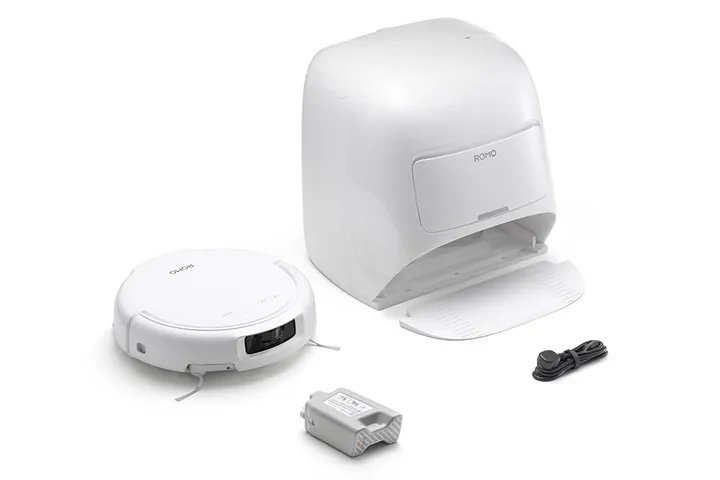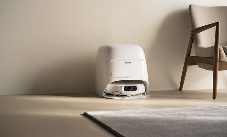 Designed to integrate seamlessly into any home decor, the ROMO S boasts an elegant all-white finish with soft, flowing lines on both the robot and the base station.