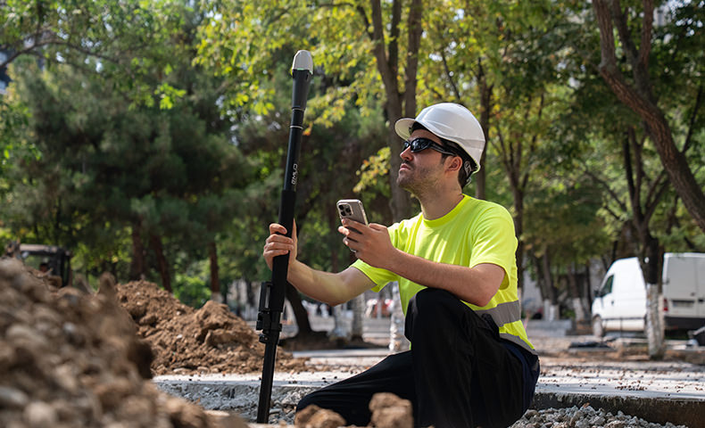 The receiver’s GNSS chip supports all existing constellations and bands, with 672 channels. It tracks GPS, GLONASS, Galileo, BeiDou, QZSS, and NavIC, providing stable performance even in urban areas or under tree canopy. It gets corrections from any CORS or NTRIP service using the RTCM3 input data format. The device cannot be used as a base and does not log raw data for PPK.